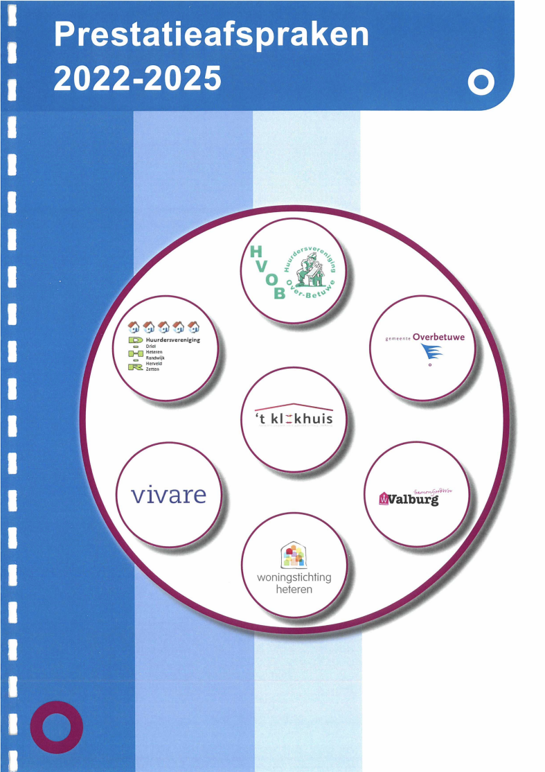 Dit document bevat de meerjarige prestatieafspraken 2022–2025 (met jaarafspraken 2022) tussen gemeente Overbetuwe, de lokale corporaties (Woningstichting Heteren, Woonstichting Valburg, Vivare) en hun huurdersorganisaties. Het legt per hoofdthema (o.a. nieuwbouw/voorraad, verduurzaming incl. klimaatadaptatie, bijzondere doelgroepen, wonen & zorg en leefbaarheid) de gezamenlijke doelen, monitoring/indicatoren en de concrete acties met trekkers vast.