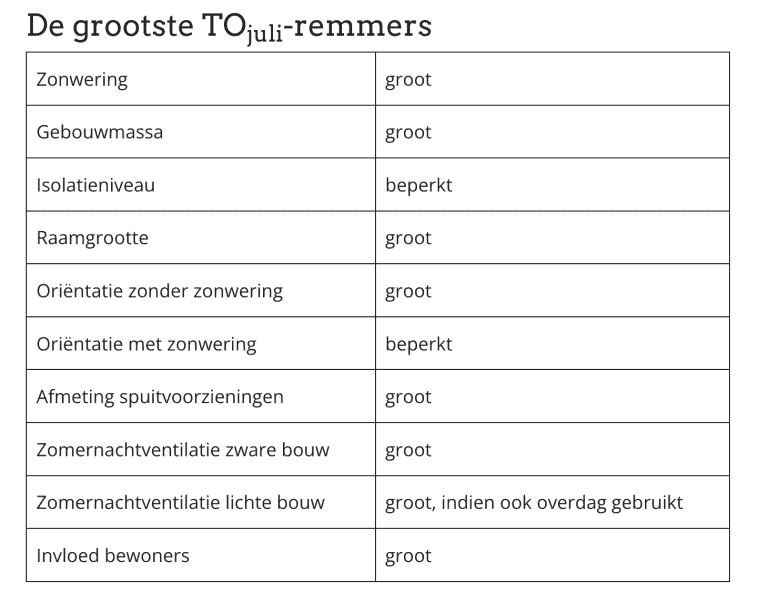 De overheid heeft voor nieuwbouwwoningen een grens gesteld aan de kans op temperatuuroverschrijding om te bevorderen dat woningen ook in de zomer comfortabel zijn. Deze kans wordt uitgedrukt met het indicatiegetal TOjuli. Cees Leenaerts (W/E Adviseurs) licht in dit artikel toe wat dit getal betekent en hoe je kunt zorgen dat TOjuli niet hoger is dan 1,0. (opm: de grenswaarde is inmiddels versoepeld naar 1,2)