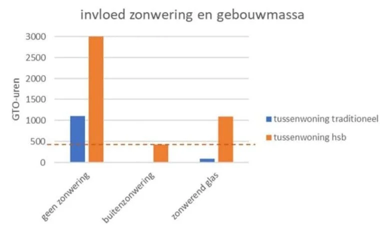 De kans op temperatuuroverschrijding kun je bepalen met een dynamische berekening. Daarvoor bestaat simulatiesoftware. Je voert alle gegevens van de woning in en het programma berekent hoe de temperatuur in verschillende ruimtes verloopt. Dat vergelijk je met een norm. Vervolgens is het een kwestie van tellen hoeveel uur per jaar deze norm wordt overschreden. Een grote overschrijding telt zwaarder dan een kleine, waarmee de som het gewogen aantal uren temperatuuroverschrijding is. Volgens de bouwregelgeving mag het aantal GTO-uren niet groter zijn dan 450.