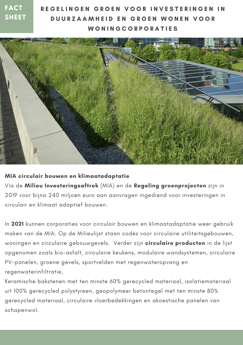 Dit document is een factsheet voor woningcorporaties met een overzicht van (fiscale) regelingen en subsidies om te investeren in duurzaamheid, circulair bouwen en klimaatadaptatie. De nadruk ligt op de MIA/Vamil (met voorbeelden en Milieulijst-codes voor o.a. vegetatiedaken, gevelbegroeiing en het versterken van biodiversiteit/hittestressreductie) en het verwijst daarnaast naar aanvullende landelijke, lokale en Europese regelingen (zoals SDE++, ISDE, EIA, INTERREG, Horizon, EFRO) en waar je die kunt vinden.