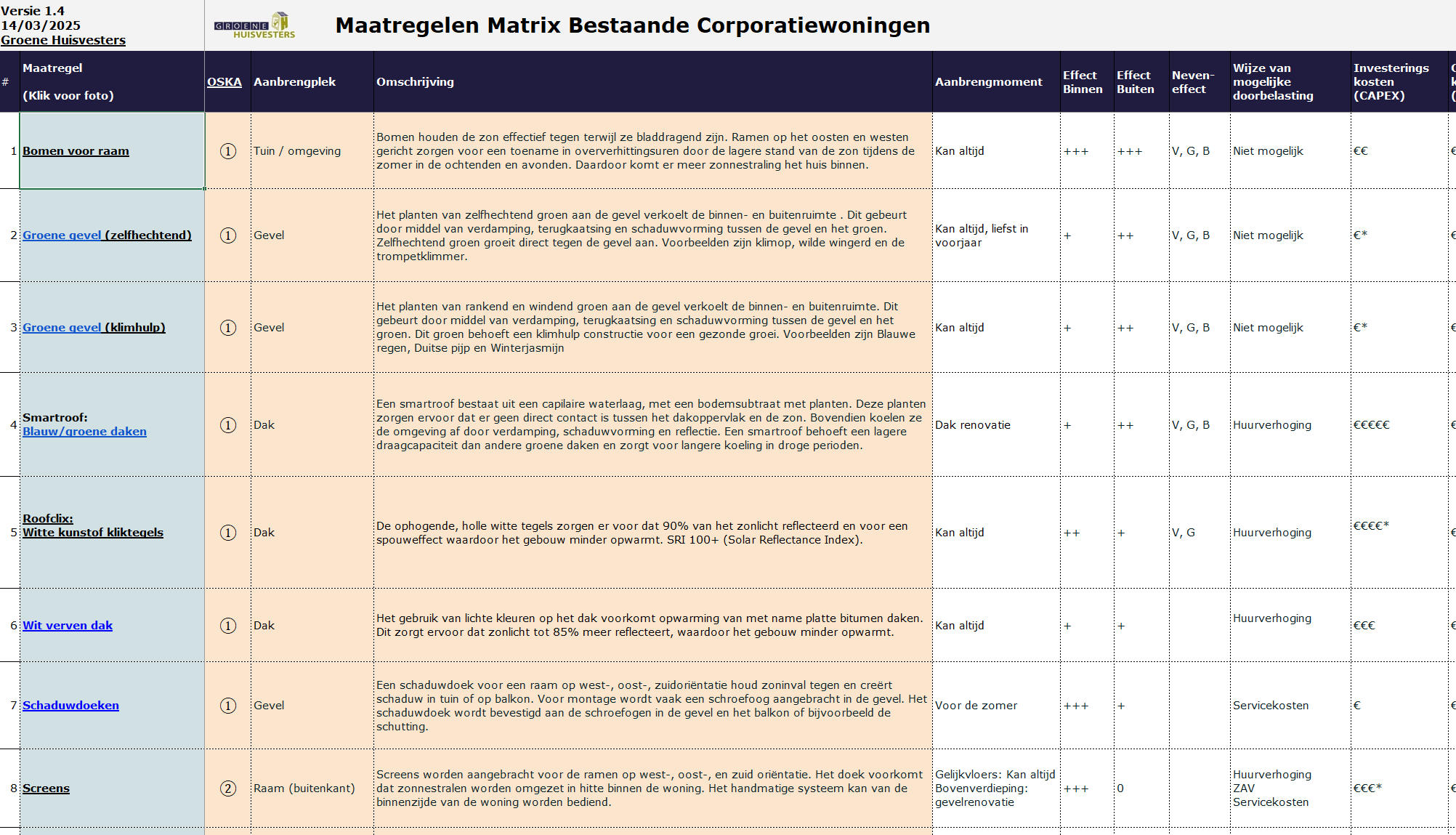Hittebeperkende maatregelen zijn er in verschillende soorten en maten. In de maatregelenmatrix worden 26 maatregelen beoordeeld op 10 criteria, zoals effectiviteit, kosten en gebruiksvriendelijkheid. Deze matrix is bedoeld als ondersteuningsmiddel bij de afweging van maatregelen en geeft een brede afspiegeling van het huidige marktaanbod. De effectiviteit en prijs zijn indicatief, op basis van een marktonderzoek in de periode november 2023 en april 2024.